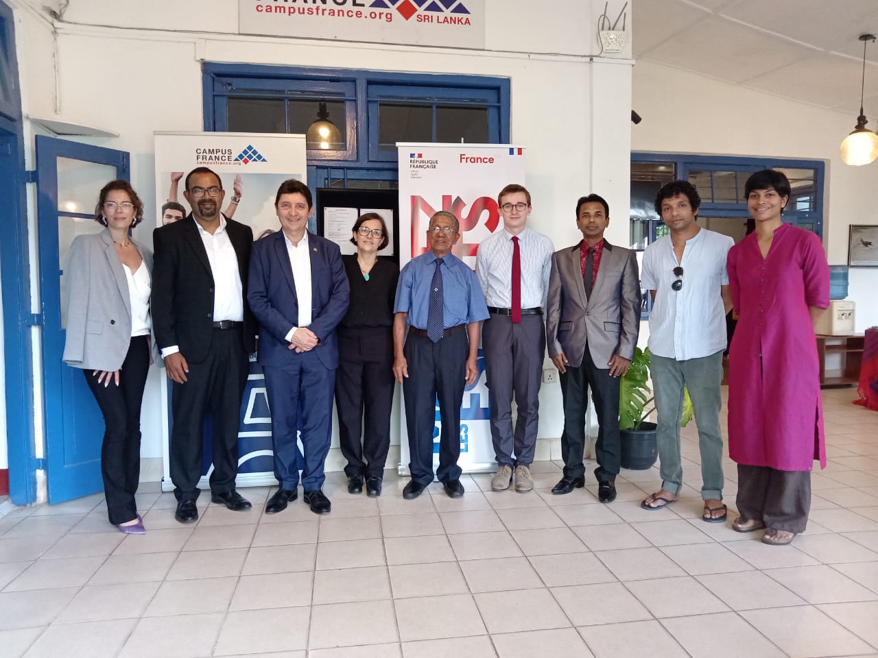 From left to right: Mrs. Julie Guibreteau, Director of the Alliance Française de Kandy, Mr. Sabry Abuthahir, President of the Alliance Française de Kandy committee, Mr. Olivier Cadic, Senator, Mrs. Marie-Noëlle Duris, First Counselor at the French Embassy in Sri Lanka, Mr. J.K. Wijedasa, Treasurer of the Alliance Française de Kandy, Mr. Nathanël Drochon, intern at the French Embassy in Sri Lanka, Dr. Dhanuka Bandara and Mr. Akalanka Suriyabandara Gunasekera, members of the Alliance Française de Kandy committee, and Mrs. Chathurika Senanayake, Vice-President of the Alliance Française de Kandy.
